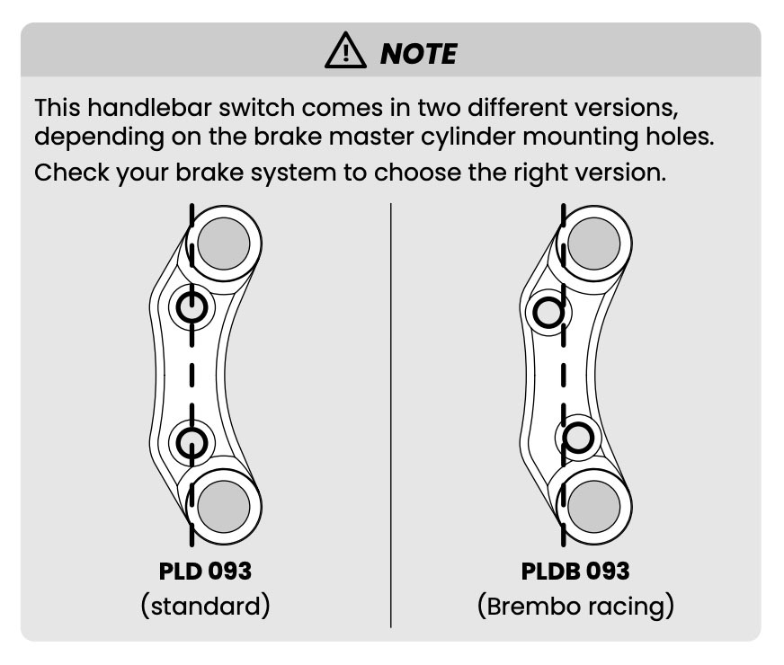 Switch mounts to the rear of the front brake master cylinder - OE, Brembo RCS and Corsa Corta - inline fitment. For offset Brembo race fitting please see other listing/related items.